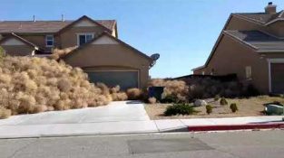 Tempestade de vento deixa cair tumbleweeds no bairro Victorville