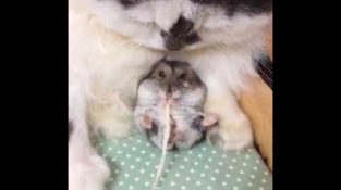 Lucy o hamster não conseguia decidir entre ter um lanche e afagando acima com seu amigo, Chefe do gato. Depois de pegar um pedaço de comida, ela mentiu entre as patas do chefe e mordiscou seu deleite.