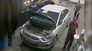 Em uma garagem em Moscou, dois engenheiros poupados por um milagre o acidente, quando um carro está pregado na parede do edifício.