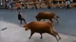 Um jovem consegue escapar com grande habilidade os ataques touros consecutivos em uma rua de Espanha.