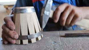 Cooper Pavlo Kondratyuk da Ucrânia, mostra que constrói o barril em miniatura em sua oficina.