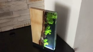 A construção de uma lâmpada decorativa de resina epoxi e choupo, que é iluminada com lâmpadas de LED.