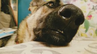 Sonolento, Jovi o pastor alemão não pode resistir a cantar, ouvir um pedaço de Billy Joel.