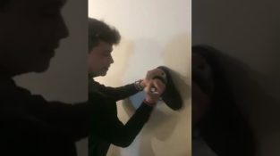 Um jovem quer abrir uma garrafa de vinho usando a técnica do sapato em uma parede.