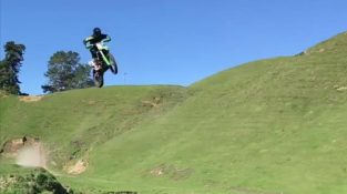 O Jonathan Martelli fazer alguns saltos espectaculares em uma motocicleta em Reporoa caldeira Nova Zelândia.