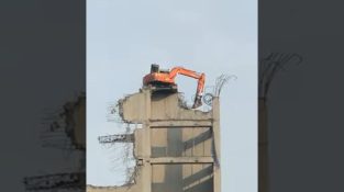 Em Jacarta, na Indonésia, uma escavadeira colocado pelo guindaste sobre um edifício, a fim de demoli-la. idéia não muito inteligente.