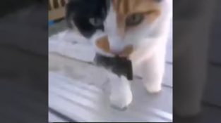 Um gato pega um rato sem o matar, e deixá-lo na porta do proprietário.