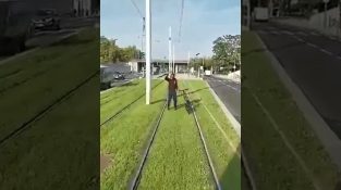 Um chifre motorista bonde em um ciclista líder nos trilhos. Mas o homem na bicicleta não quero estragar o passeio, perto de eléctrico limpadores chateado e dobrados.