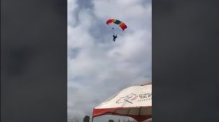 Um pára-quedista fez um pouso arriscado, mas perfeito no meio da multidão. Eventualmente, nós achamos que este é um pequeno pára-quedista não tripulado. O homem com o aperto de mão controla as terras como.