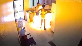 Uma padaria de repente explode em uma cozinha, enquanto duas mulheres cozinhar. Felizmente, não feridos.