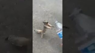Em um parque, um esquilo sedento insiste em um pouco de água de um homem segurando uma garrafa de água nas mãos. Ele se levanta e balança as pernas da frente para ser entendido.