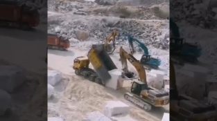 Os operadores de três máquinas pesadas trabalham juntos, colocar um pedaço grande de mármore no balde de um caminhão.