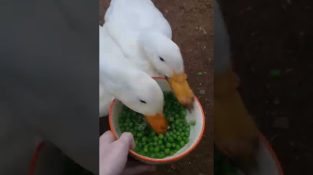 Em um jardim, patos Pepé e Arnold avidamente comem uma tigela de ervilhas.