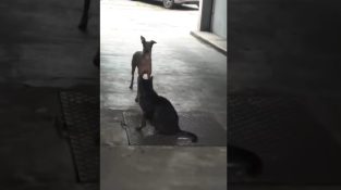 Um cão quer impressionar um gato com seus movimentos de dança.