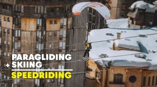 O planador de velocidade Valentin Delluc realiza alguns truques no resort deserto de Avoriaz (Morzine, França).