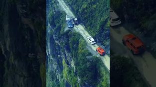 É assim que os veículos se movem em ambas as direções em uma das estradas mais perigosas do mundo., a estrada Yungas na Bolívia. A estrada liga a região da floresta amazônica [...]
