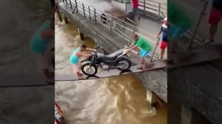 Dois homens tentam carregar uma motocicleta de um píer para um barco, usando uma placa longa e fina. No final, ninguém se surpreendeu com o esperado fim da motocicleta.