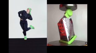 A dançarina e atriz Smac McCreanor reproduzia com os movimentos de seu corpo objetos esmagados por uma prensa hidráulica.