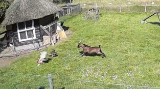 Um galo e uma cabra resgatam uma galinha de um falcão