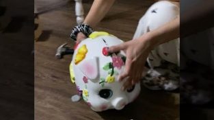Uma mulher quebra seu grande cofrinho de porcelana após dois anos de economia.