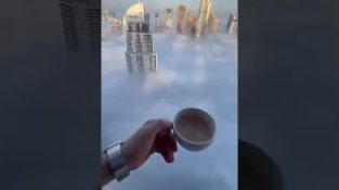 Na varanda de um arranha-céu em Dubai, alguém está tomando um café.