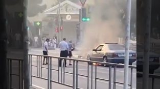 Um homem tenta apagar um incêndio em seu carro com um extintor de incêndio, quando ele cai das mãos e vai embora...