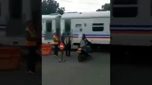 Um jovem em uma scooter para em frente a uma passagem de nível enquanto o trem passa. Sem muita paciência, o motorista da scooter tentará passar às pressas sem tê-lo visto [...]