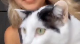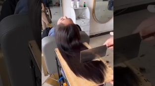Um cabeleireiro corta rapidamente o cabelo de uma mulher usando uma máquina de cortar cabelo.