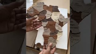 Um mapa do mundo de madeira para decoração de parede. Da empresa ucraniana 'Enjoy The Wood'.