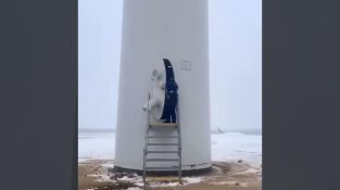 Um trabalhador na China nos mostra o interior de uma turbina eólica até o topo.