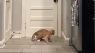 Enquanto ele caminha pela casa, um gato de repente se sente ameaçado por uma parede.