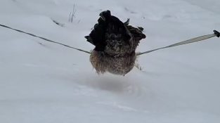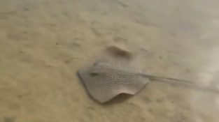 Um homem grava com seu celular um esquife na parte rasa do mar, quando de repente o trenó vem correndo em sua direção.