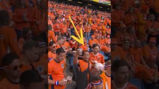 Durante uma partida da Euro 2024 na Alemanha, um espectador saúda a câmera e imediatamente após a bola atingir seu rosto.