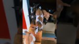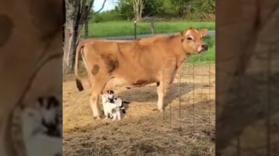 La o fermă din Statele Unite ale Americii Maine, doi copii mici alaptati de la vaca Butterworth, care nu pare să fie deranjat în mod special.