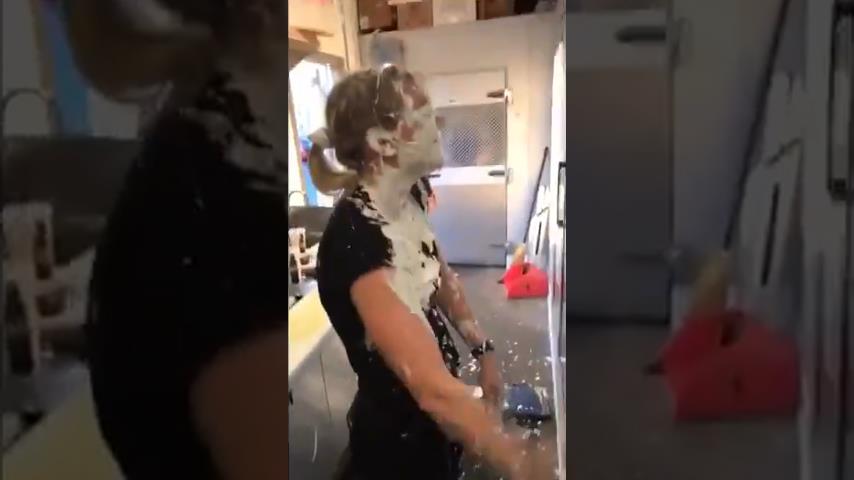 Într-un restaurant din California, un angajat aruncă accidental o găleată pe podea cu sos. După căderea, sos împușcat pe fata ei.