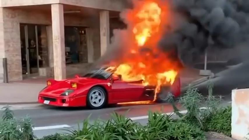 Un Ferrari F40 a cărui valoare este estimată la 1,3 milioane de euro, pe foc pe o strada din Monte Carlo în Monaco. De la balconul casei sale, un om încearcă în zadar să stingă focul cu un furtun de grădină.
