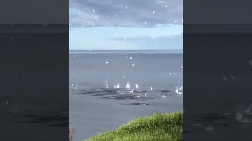 Păsările de mare se scufundă de sus cu viteză mare pentru a prinde niște pești. Cel mai probabil sunt păsări Soula, cunoscut pentru această metodă de pescuit.