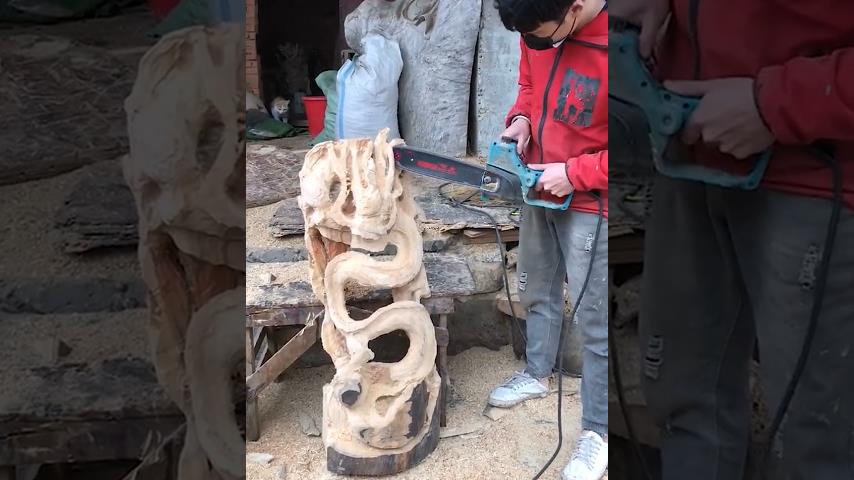 utilizatorul Sculptură în lemn17 din China, ciopleste un dragon pe un trunchi de copac.
