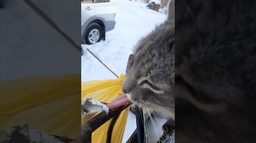 Doi ruși au găsit o pisică a cărei limbă era înfiptă în structura metalică a unui coș de gunoi. O ceașcă de apă fierbinte a salvat situația.