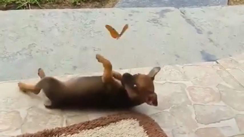 În afara casei, un cățeluș a dat peste un fluture enervant care încerca să se așeze pe botul său. Cățelușul a renunțat în cele din urmă la încercarea de a scăpa de ea.