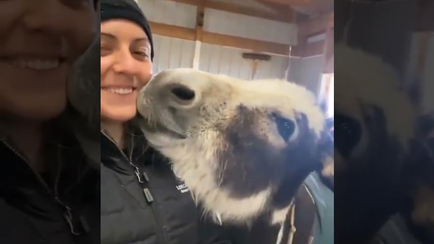 La Longhopes Donkey Shelter Donkey Shelter din Colorado, Statele Unite, un măgar își arată dragostea față de femeia care îl îngrijește.