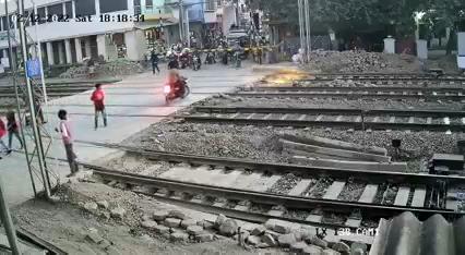 Pe o trecere la nivel de tren în India, un motociclist trece pe lângă barele de protecție închise și încearcă să treacă șinele când sosește trenul. Nu a fost o idee atât de bună...