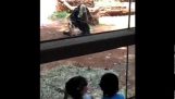 Un cimpanzeu la grădina zoologică Welsh Mountain din Colwyn Bay, Țara Galilor, face gesturi cu degetul cerând unei femei să deruleze pe smartphone-ul ei.