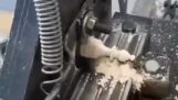 Preparare de ciocolată albă cu metoda tradițională și ustensile de lemn în mediul rural.