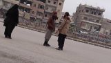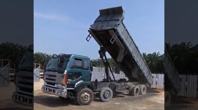 Un camion este răsturnat pe măsură ce șoferul său golește solul de la găleata răsturnată. Apoi șoferul se lansează din cabina sa și aterizează violent pe teren.