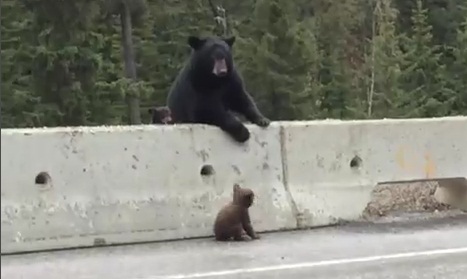Un urs mama trage ursuletul peste baricade de protecţie şi de autostrada periculoase. British Columbia, Canada.