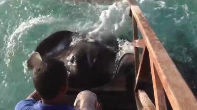 În Maldive, turişti vizionarea un Skate care sare de pe o rampa din lemn cere lui hrană.