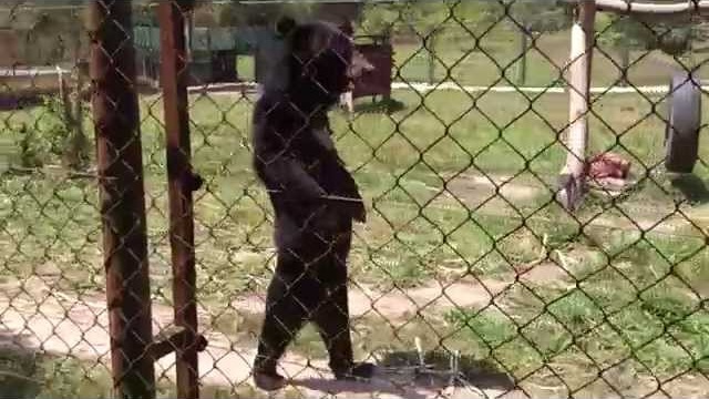 Amuzant comportamentul unui centru de salvare a faunei sălbatice de urs negru asiatic, mersul pe jos pentru un pic pe picioarele ei ciută, la fel ca un om.