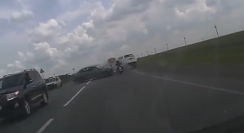 La 26 pe autostrada Rostov-Taganrog în Rusia, accident incredibil are loc, Din fericire, fara victime. Conducătorului auto de o Toyota Avensis pierde controlul vehiculului său atunci când unul dintre lasticha de atingerea, şi maşina lui se ciocneşte cu un plagiometwpika Nissan X Trail care se mută în din sens opus.