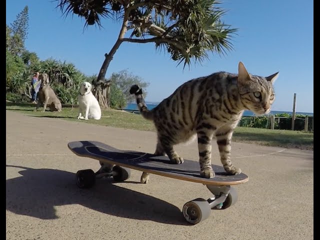 Aceasta pisica face doar skateboarding, dar, de asemenea, a învăţat cum să se împingă pe scândură. Antrenor animale Australian Robert Dollwet, a antrenat multi-talentat pisică de Bengal numit Boomer, pentru a utiliza un skateboard a face plimbari.